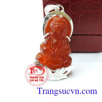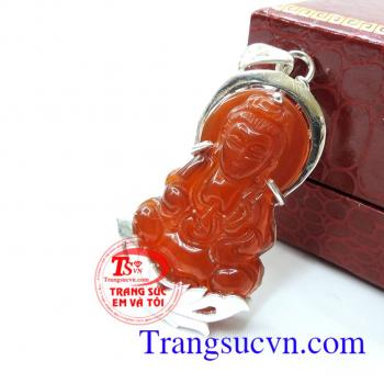 Mặt quan âm mã não đỏ trong, mặt phật quan âm ngự trên tòa sen bạc điêu khắc tinh xảo, đá mã não đỏ biểu tượng của sức khỏe, sự hưng thịnh và trường thọLoại sản phẩm: Mặt dây chuyền nữ bạc đẹp